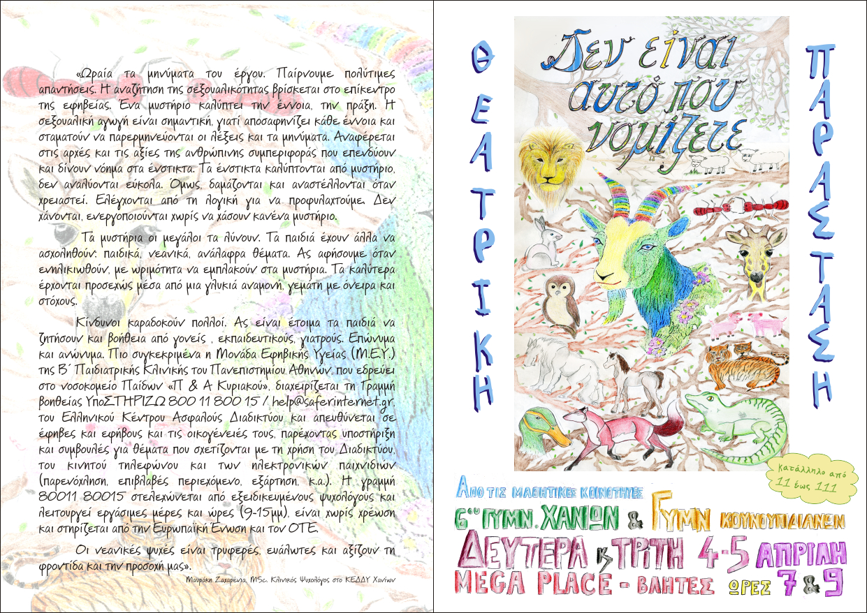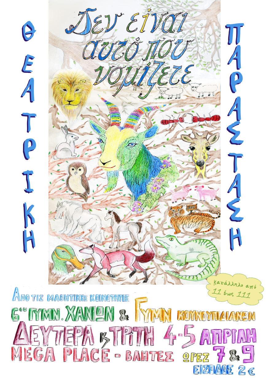 θεατρική ομάδα του 6ου Γυμνασίου Χανίων παρουσιάζουν τη θεατρική παράσταση "Δεν είναι αυτό που νομίζετε!". Δευτέρα 4/4 και Τρίτη 5/4, στις 19:00 και στις 21:00, στο Mega Place στο Βλητέ.